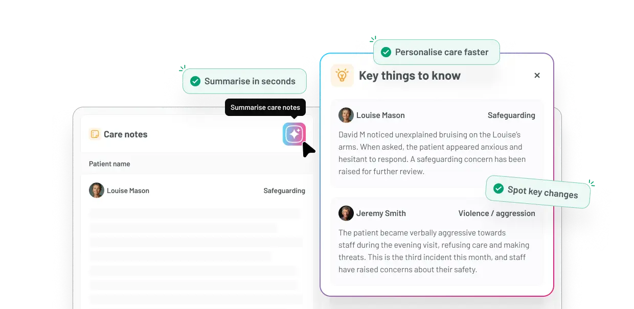 PASSgenius™ reads weeks of care notes in seconds, and gives you clear, simple summaries and recommendations, so you can act quickly, keep care person-centred, and save hours on paperwork.